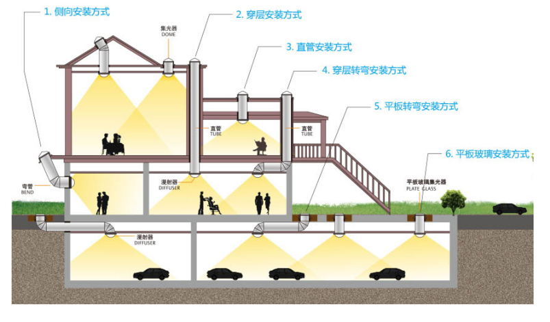 其原理就是光线折反射,将室外的自然光(包括直射阳光-晴天和漫射阳光-阴雨天)通过高反射镜面材料反射传输到扩散透光板,均匀释放到室内,为室内提供自然采光照明。 产品由“采光区+光线传输区+光释放区三大部分组成”。是一种通过高反射率、光学仪器级别的导光管道将自然光传导到室内的成套系统,可以大幅提高自然光利用效率。