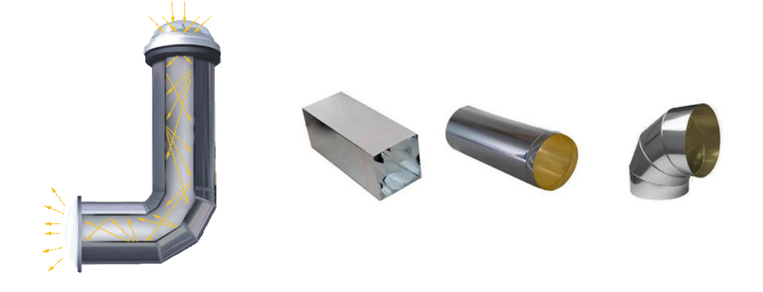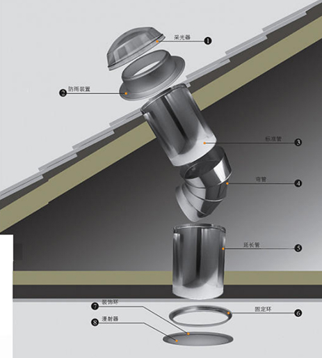 其原理就是光线折反射,将室外的自然光(包括直射阳光-晴天和漫射阳光-阴雨天)通过高反射镜面材料反射传输到扩散透光板,均匀释放到室内,为室内提供自然采光照明。 产品由“采光区+光线传输区+光释放区三大部分组成”。是一种通过高反射率、光学仪器级别的导光管道将自然光传导到室内的成套系统,可以大幅提高自然光利用效率。